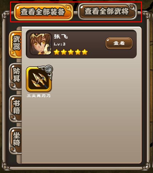 3、 通过选择“查看全部装备”或“查看全部武将”来找到想要强化的装备;