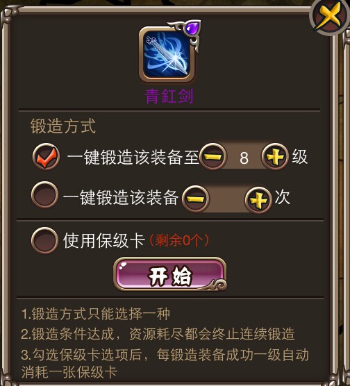 连续锻造:可选择金币或者元宝,设定预期强化到的等级,或者准备强化的次数,省去多余操作