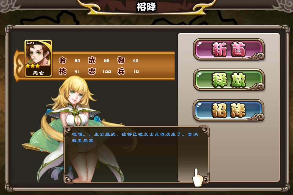 成功攻打下一座城池会有一些被打败的武将,这时候会出现招降打画面,会出现三个选项:“斩首”,“释放”,“招降”。