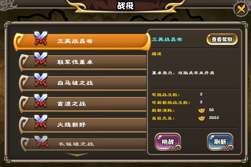 4、 每个玩家每天有3次免费战役次数,使用元宝可重置;